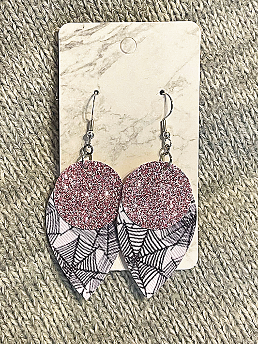 Pink Glitter Spiderweb Faux Leather Halloween Earrings