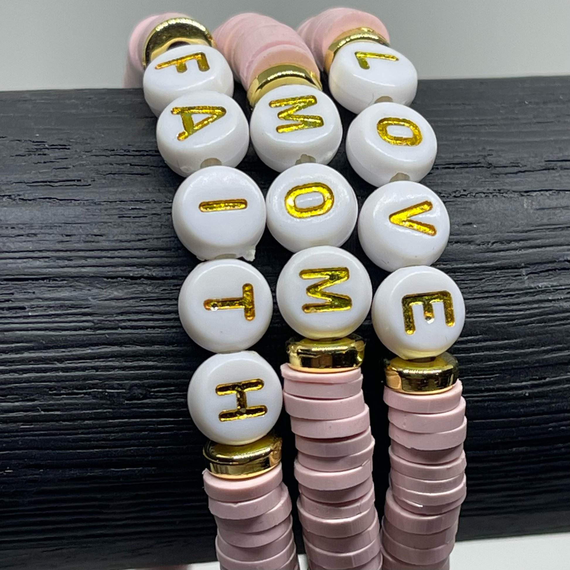 Choose your size, and then choose a wording option, from the ones shown or create an idea of your own! All letters available, along with heart shapes are available. Perfect for kids names and more. Grab one bracelet, or a few to create your perfect bracelet stacking set! (Other color options available)