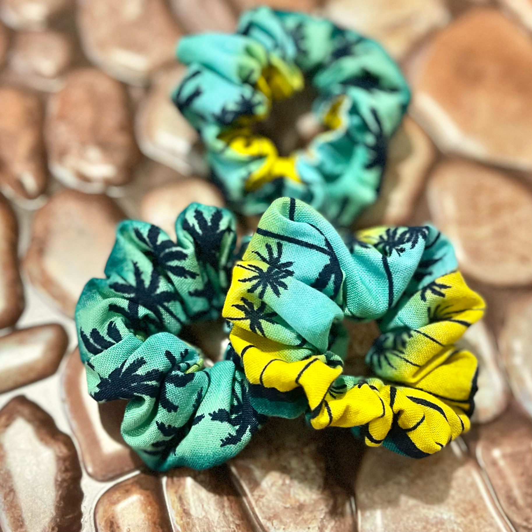 Keep those little curls in place with the Erica mini scrunchie! Bursting with tropical vibes, this fun accessory features a cheerful blue and yellow palette adorned with palm tree patterns. The perfect pint-sized pick for any young girl's hair collection.