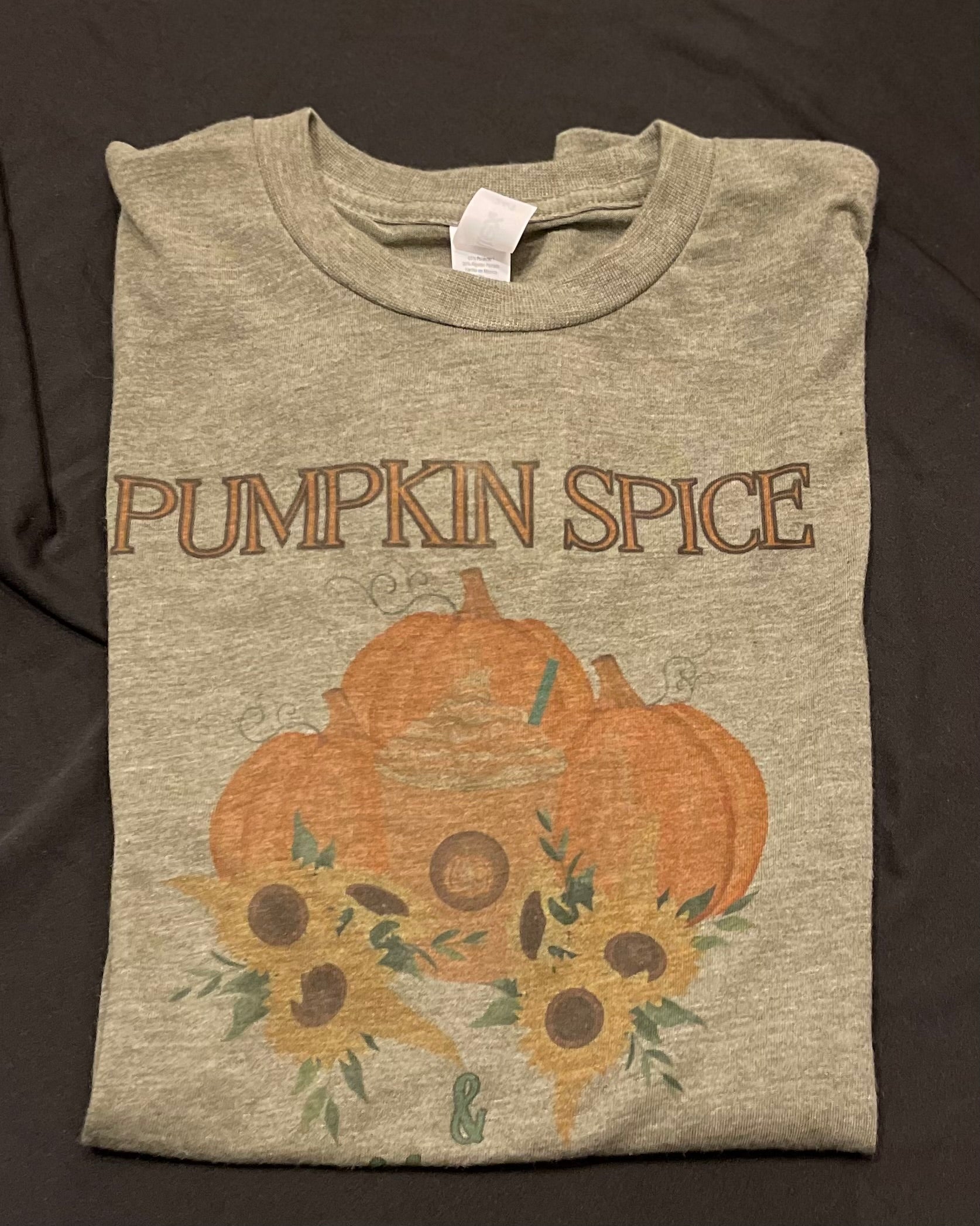 Introducing this Green Pumpkin Spice & Everything Nice tee, a green polyester/cotton blend shirt featuring pumpkins, sunflowers and coffee graphic with quote "Pumpkin Spice and Everything nice"