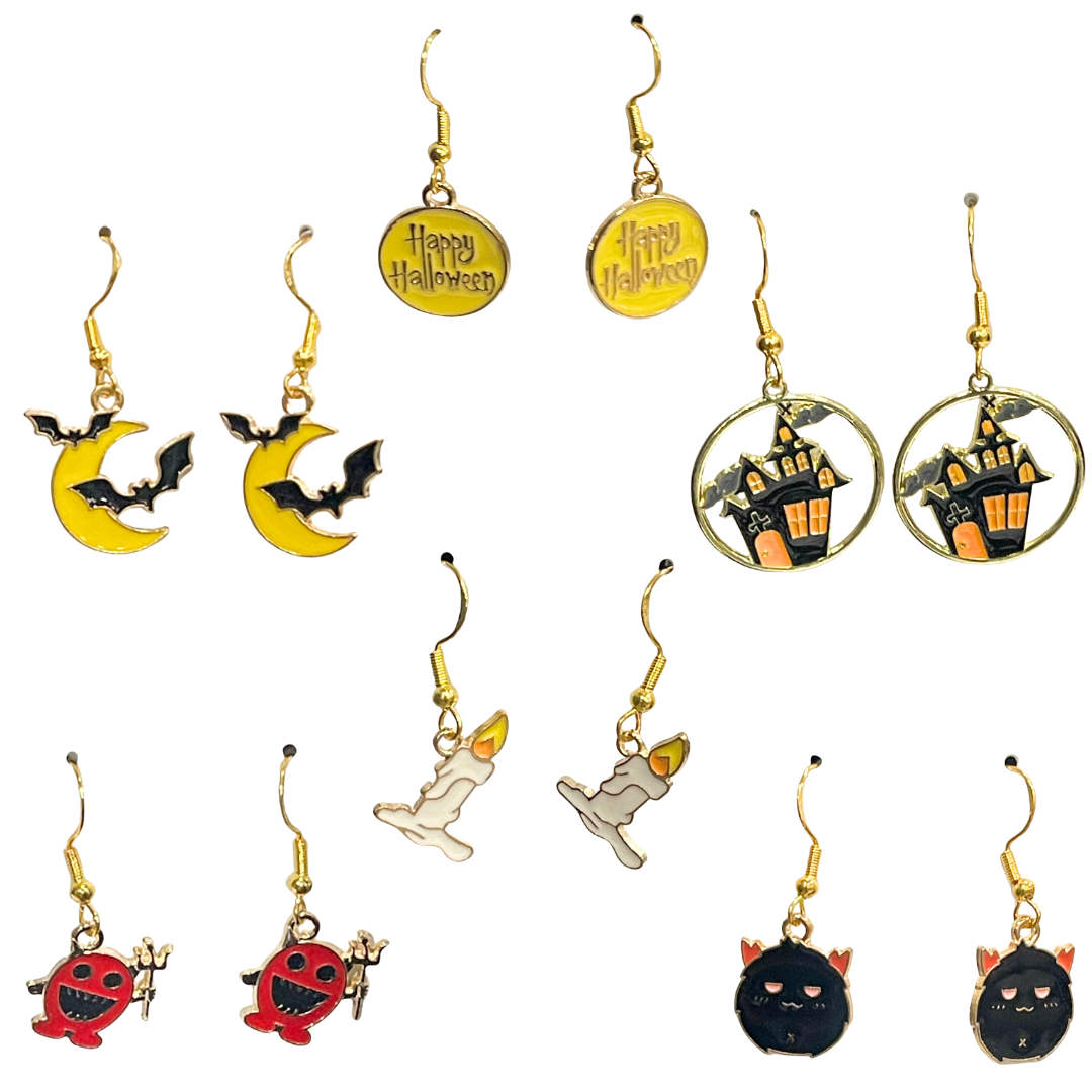 These Halloween-themed earrings showcase fun halloween designs- a moon with bats, candles, "Happy Halloween" saying, haunted house, red devil, and a black monster ...perfect for seasonal celebrations. These beaded dangle halloween earrings are handmade with .925 Sterling Silver or .925 Sterling Gold ear wires to ensure both comfort and lasting quality throughout the festive season.