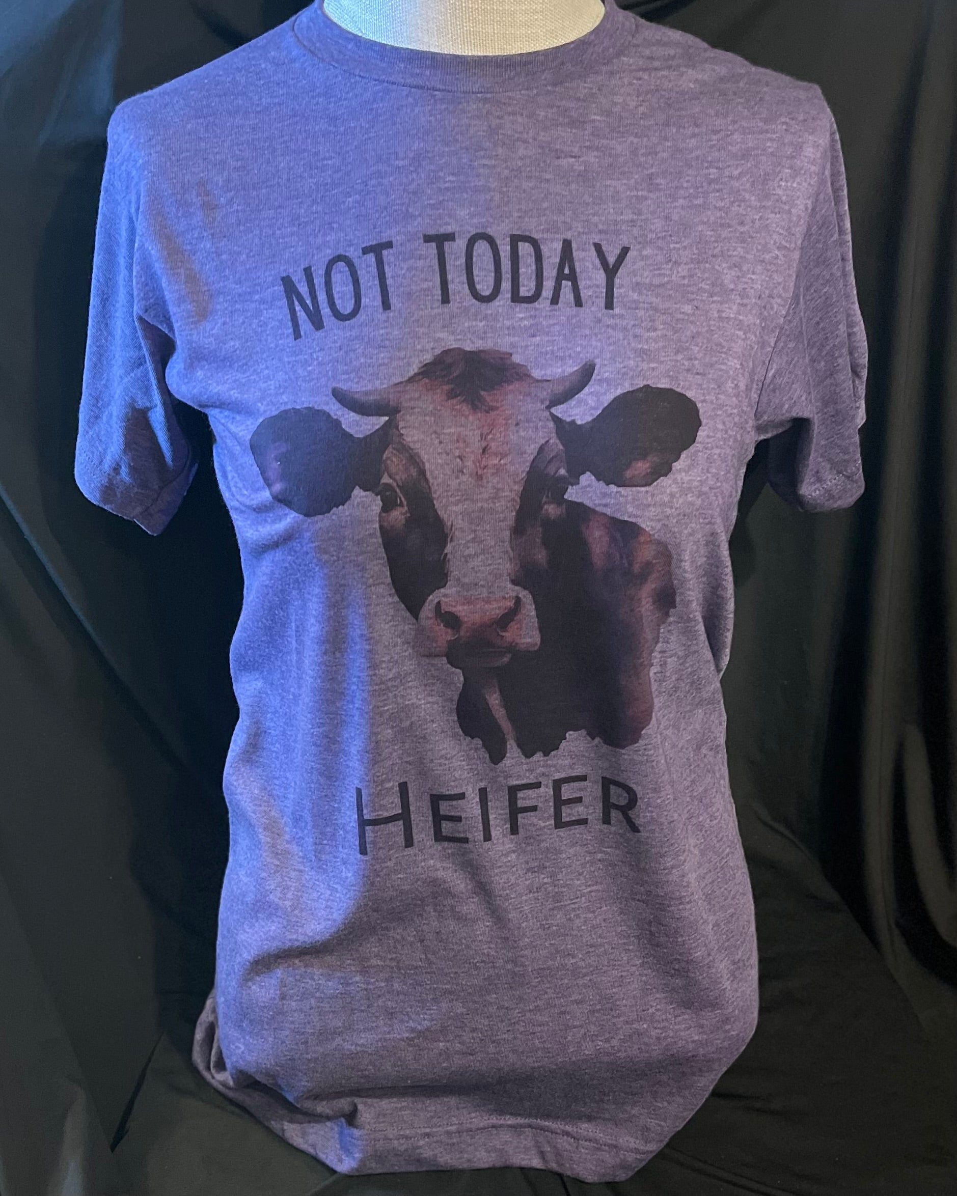 Elevate your casual wardrobe with this purple shirt featuring a cow with a funny quote. This Tultex brand t-shirt is a polyester-cotton blend shirt, allowing for lasting comfort. This tee showcases a cow illustration paired with the witty phrase "Not Today Heifer"—a nod to those moments we can all relate to.